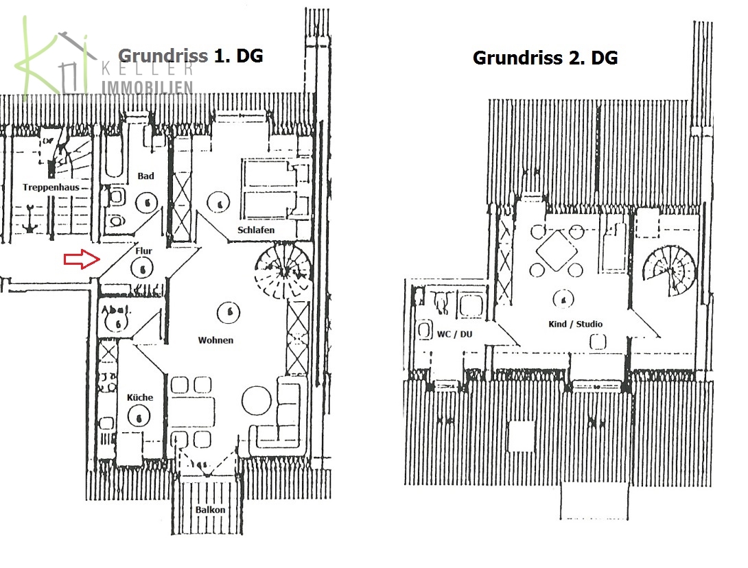 AUSSTATTUNG: Im 1. DG - großes Wohnzimmer mit Balkon - separate Küche mit Abstellraum - Schlafzimmer - Bad/WC mit Badewanne, WM.-Anschl. und Fenster - Flur - Treppe zum 2. DG